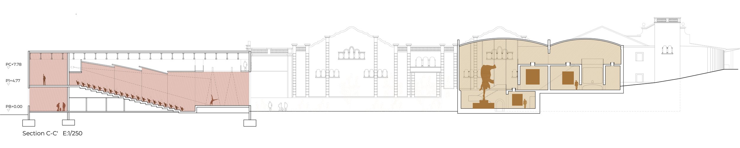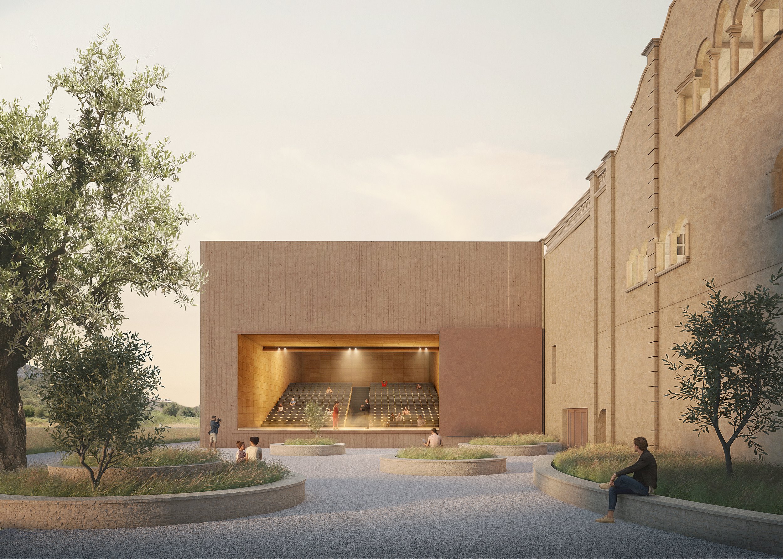 La nostra proposta pretén, per davant de tot, mostrar un gran respecte a l’arquitectura existent. Per això, tota la intervenció contemporànea es diferencia d’aquesta també a través de la materialitat. S’adopta un to vermellós-terrós per a les noves construccions i els nous materials – metall i formigó – són lacats d’aquest to.